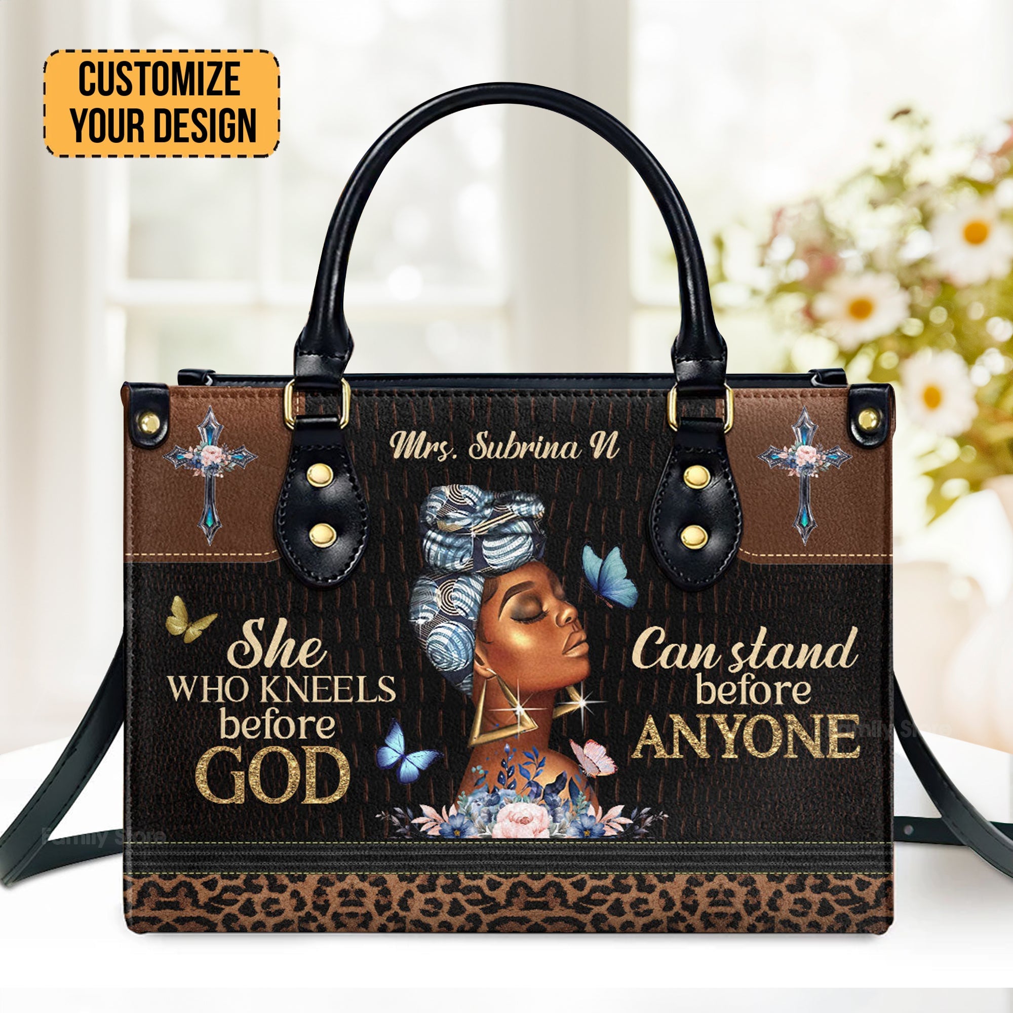 FamilyStore Personalized Leather Handbag intertwines faith and fashion, creating an uplifting accessory for Christian women. Adorned with meaningful Bible verses, each handbag carries a piece of your faith journey wherever you go. It's a profound reminder of love and strength within you. Perfect for yourselfor as a heartfelt religious gift for Christian ladies on special occasions.